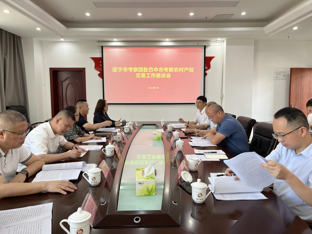 7月4日,由遂寧市政府副秘書長劉旭帶隊,遂寧市農(nóng)業(yè)農(nóng)村局副局長劉罡霏、遂寧市財政局副局長何國強、遂寧興業(yè)集團黨委書記、董事長向誠、遂寧數(shù)字產(chǎn)業(yè)集團黨委書記、董事長唐清華、遂寧市金融工作局資本市場科科長黎陳等一行人員蒞臨巴中發(fā)展控股集團有限公司考察農(nóng)村產(chǎn)權交易工作并召開座談會,巴中市政府副秘書長何潔明主持會議,巴中市農(nóng)業(yè)農(nóng)村局副局長馮金光、農(nóng)村改革科科長楊忠平、巴中發(fā)展控股集團黨委委員、副總經(jīng)理劉仕勇、成都農(nóng)交所巴中分公司總經(jīng)理、巴中市鑫匯農(nóng)業(yè)服務有限公司執(zhí)行董事羅曉東參加會議。